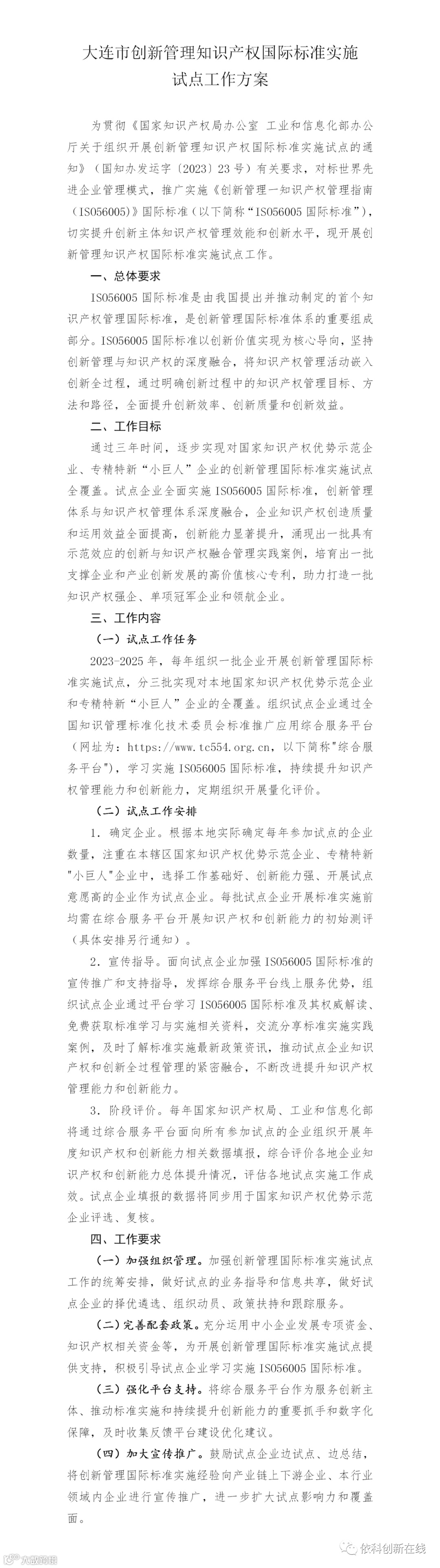 大连市知识产权局 大连市工业和信息化局关于印发大连市创新管理知识产权国际标准实施试点工作方案具体通知向下滑动即可预览或点击上方文字跳转链接