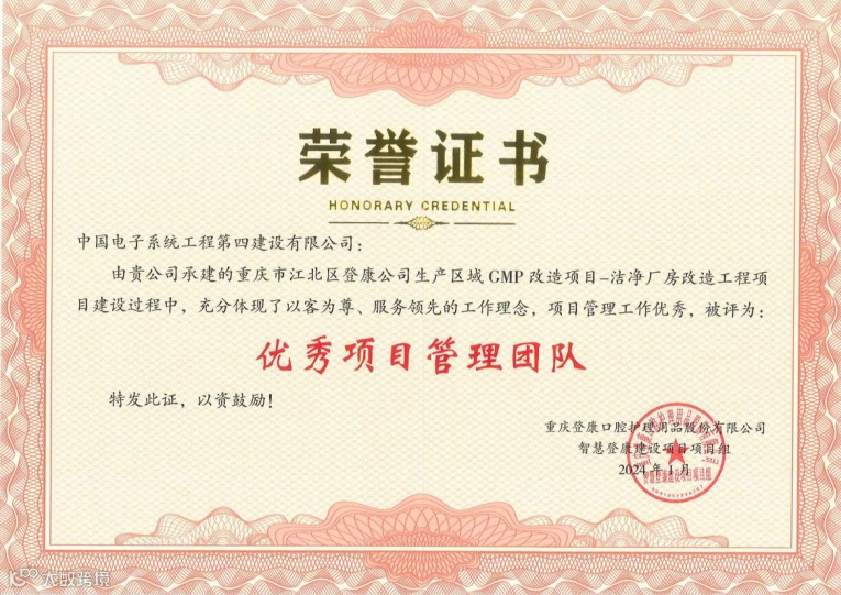 近日,重庆市江北区登康公司生产区域GMP改造项目-洁净厂房工程项目荣获业主颁发“优秀管理团队”证书。