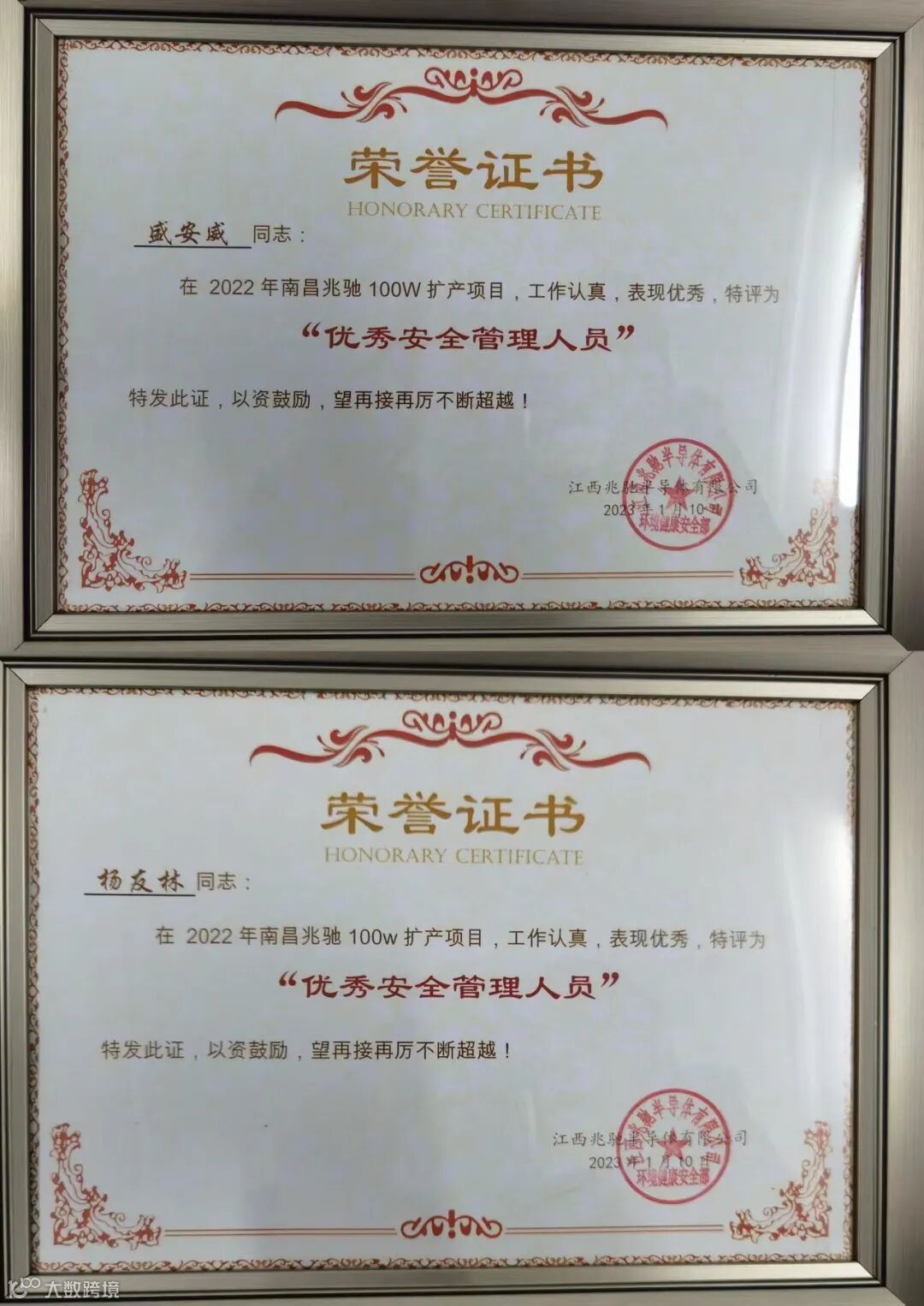 1月12日,南昌兆驰100w扩产项目获得业主颁发“优秀安全管理人员”荣誉证书。