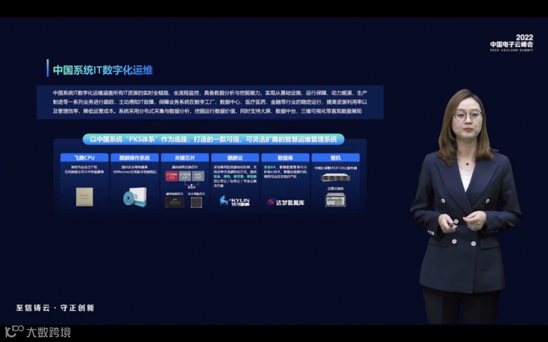中电建设彭敏对IT运维进行了补充。她介绍道,中国系统依靠安全先进绿色的自主计算体系——PKS体系,打造可信、可灵活扩展的智慧运维管理系统,提高资源利用率以及管理效率,降低运营成本。