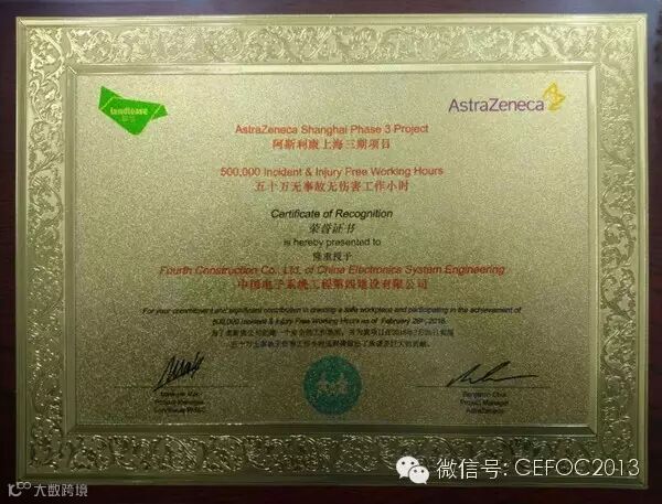 2016年2月25日,阿斯利康上海三期项目从开工至今实现50万安全工时。为此业主、管理公司和中电四公司共同举办了“阿斯利康上海三期50万安全工时庆典”活动,对安全表现突出的公司及个人进行了表彰。