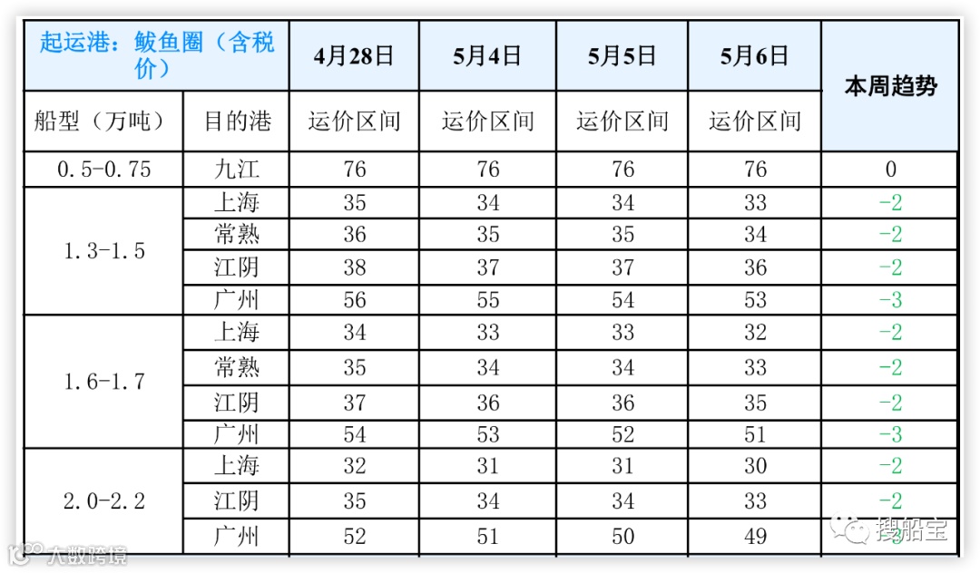 二、5月4-5月6日鲅鱼圈各吨位、航线运价汇总图日大连各吨位、航线运价汇总图