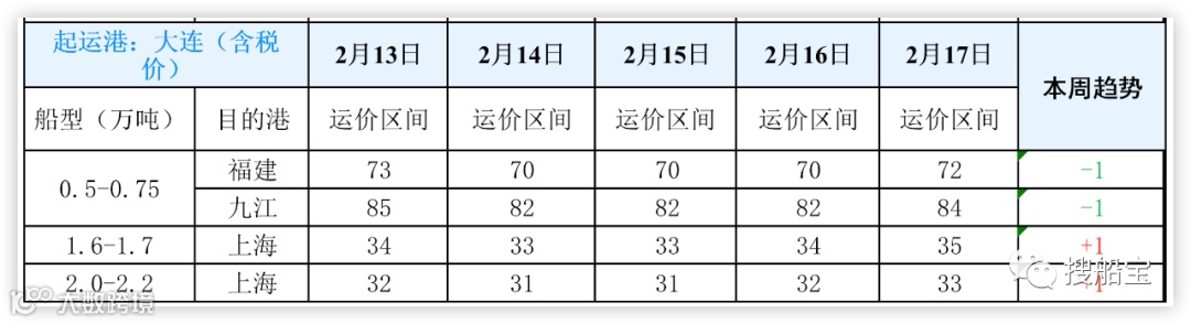 二、2月13-2月17日鲅鱼圈各吨位、航线运价汇总图日大连各吨位、航线运价汇总图