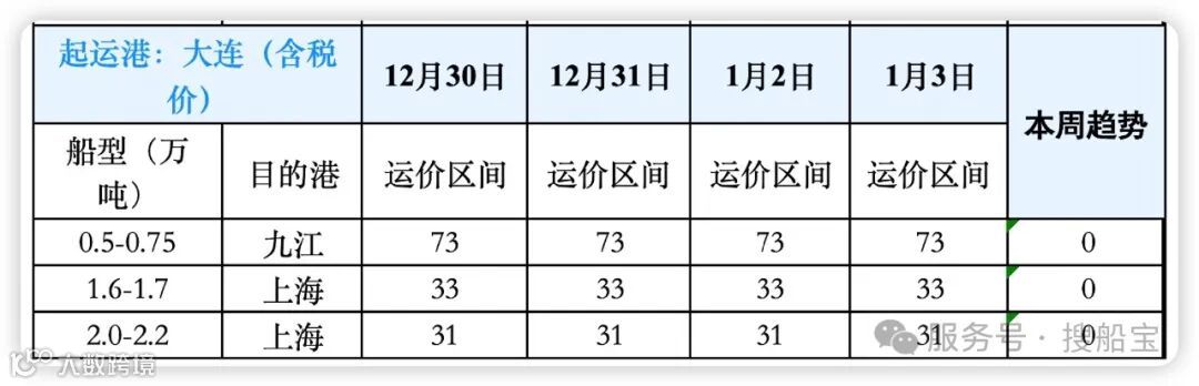 二、2024年12月30-2025年1月3日大连各吨位、航线运价汇总图