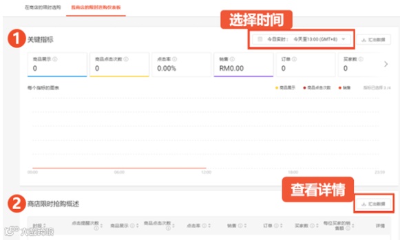 您可以查看每一次限时选购活动的详细信息。详细信息将包括: ①此促销活动中的销售关键指标;②商品销售排名。