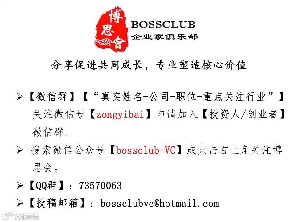 关注我们-点击上方蓝字“博思会”,更多干货分享,欢迎天使投资人,创业者,VC/PE投资人"实名制+公司/机构+职位"关注微信号“zongyibai”申请加入创业者与投资人微信群。