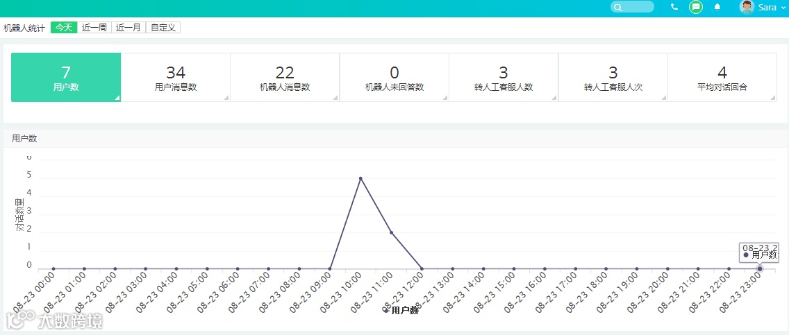 在逸创云客服后台,企业可以统计智能客服机器人服务的用户数、用户消息数、机器人消息数、机器人未回答数、转人工客服人数、转人工客服人次,平均对话回合等,据此完善机器人题库和知识库文档。帮助客服团队及时调整文档内容,并优化产品提供数据参考。