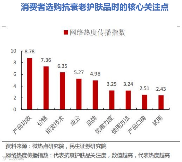 首先,得先了解消费者在选购抗衰护肤品时首要考量的依据。根据民生证券研究院对消费者选购抗衰护肤品的核心关注点调查结果显示,产品功效是位列首位的。