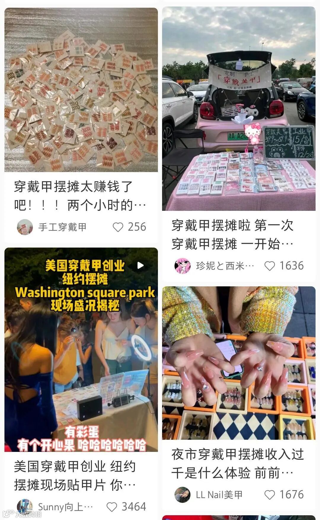 这股热潮也席卷了年轻人最喜爱的线下集市,许多摊主在小红书分享自己的穿戴甲摆摊经历,惊呼“穿戴甲摆摊也太赚钱了”,还通过摆摊积累了一批又一批的忠实客户。摆摊卖穿戴甲不仅是这些年轻人赚外快的路子,也成为他们的新型拓客社交方式。