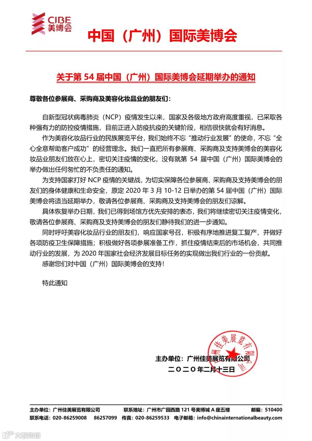 为支持国家打好NCP疫情的关键战,为切实保障各位参展商、采购商及支持美博会的朋友们的身体健康和生命安全,原定2020年3月10-12日举办的第54届中国(广州)国际美博会将适当延期举办,敬请各位参展商、采购商及支持美博会的朋友们谅解。
