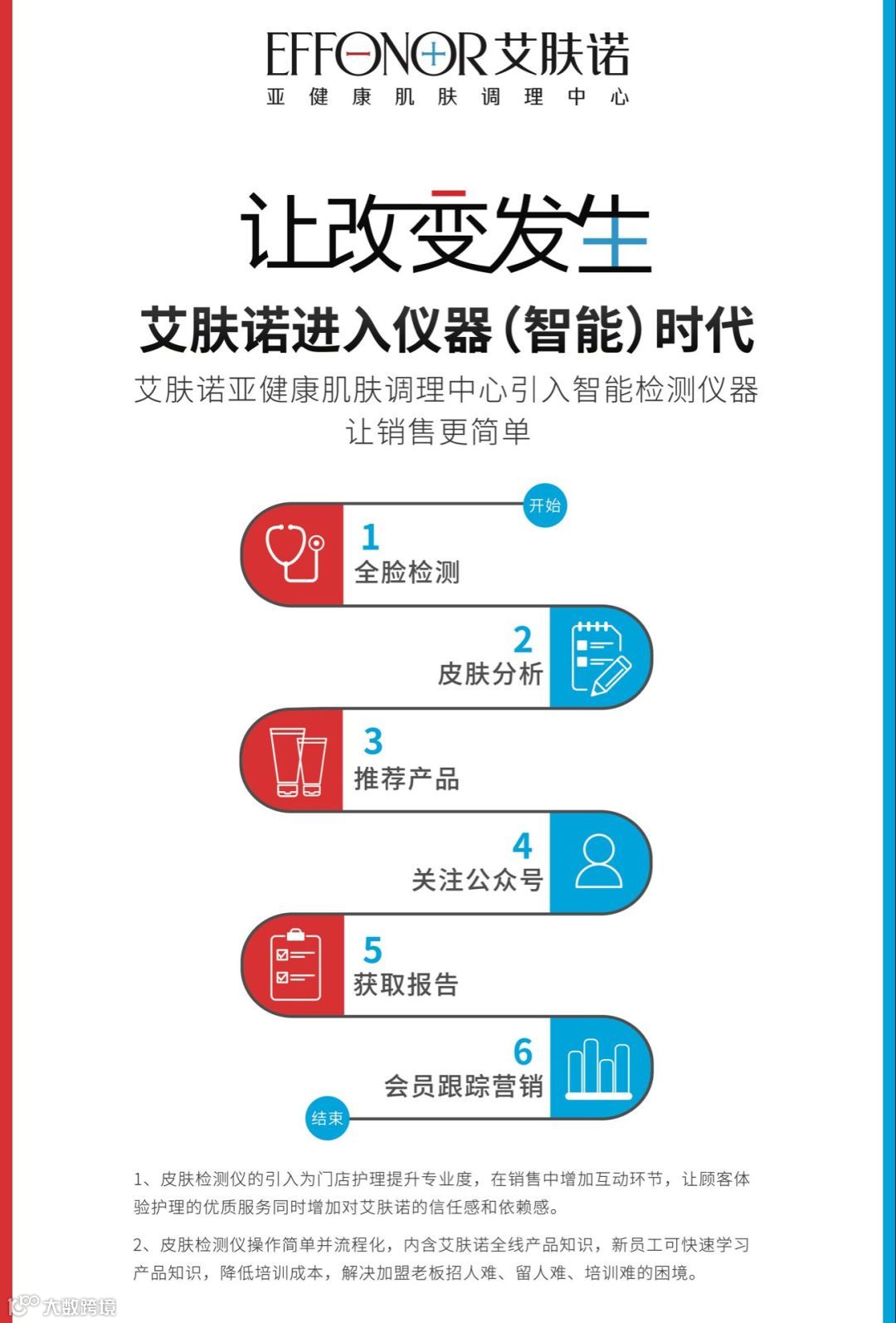 面对如此庞大的亚健康肌肤群体,艾肤诺亚健康肌肤调理中心应运而生!艾肤诺致力于肌肤亚健康的调节管理,聚焦移动互联网时代下的中产阶级女性消费者主力军,通过专业权威的检测理疗仪器,配合国家高技术企业生产产品,分诊分治,满足广大顾客追求美丽的需求。以“内调外养”的疗程式精耕会员服务。
