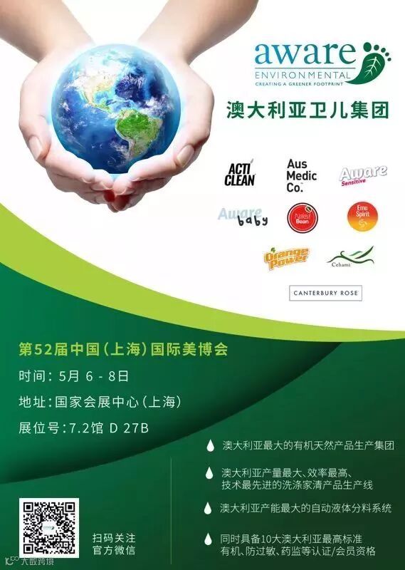 澳大利亚最大的天然有机产品生产集团卫儿集团 Aware Group 将携带自主研发的多款产品参展第52届中国(上海)国际美博会暨上海大虹桥美博会,2019年5月6日-8日与您相约国家会展中心。