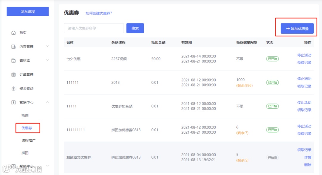 点击【营销中心】→选择【优惠券】→点击【添加优惠券】→填写优惠信息→提交审核