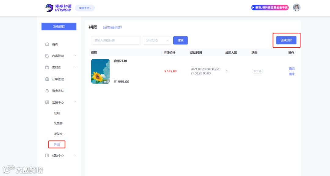 拼团作为海豚知道新上线的一个营销功能,通过裂变的方式,促使购课者在有限的时间内自发传播课程信息,携手意向用户共同购买课程,做到为达人挖掘更的多潜在客户,提高达人自身知名度,并增加达人的变现实力。