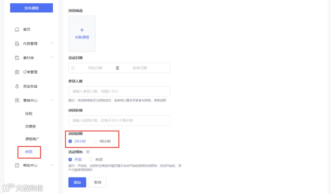 拼团时限:此功能有24小时和48小时两个时间段可供选择。选择24小时,指购课者需在24小时内完成拼团,才能以团购价格进行购买。同理,选择48小时,指购课者需在48小时内完成拼团,才能以团购价格进行购买。