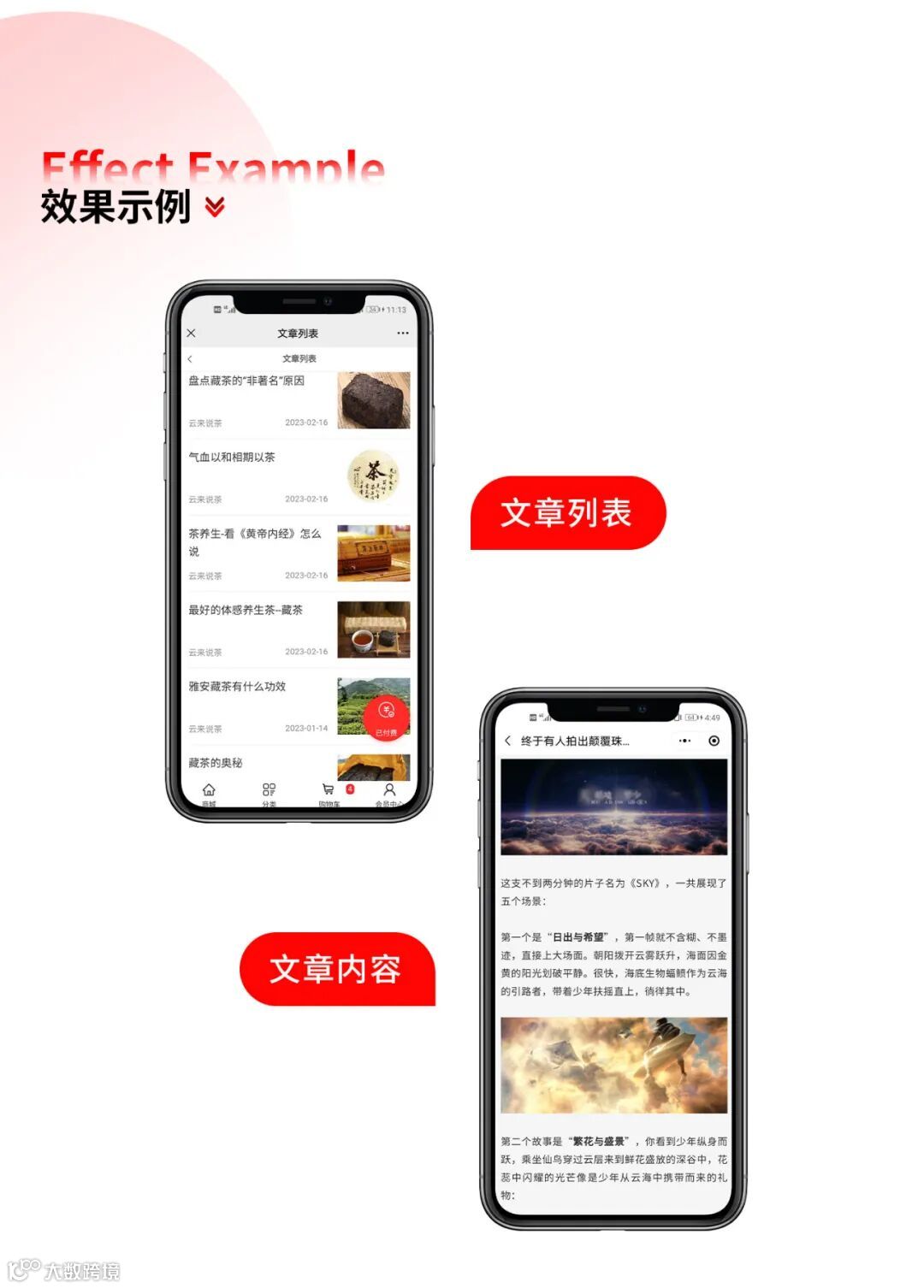 后台发布文章,并设置分享奖励,当用户将文章分享给好友,产生阅读行为时分享者获得相应的奖励;如果阅读者为首次注册商城,可以被锁定为分享者下线,前提是分享者具备推广权限,并且阅读者满足成为下线的条件。