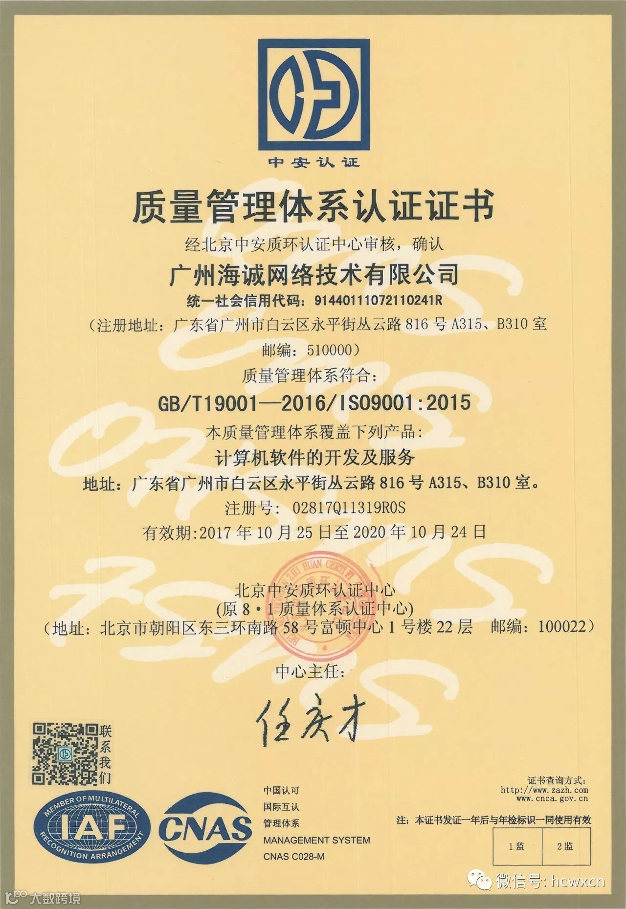 海诚快报:10月30日,广州海诚网络技术有限公司连获三大管理体系认证:ISO9001质量管理体系认证、ISO14001环境管理体系认证、ISO18001职业健康安全管理体系认证。