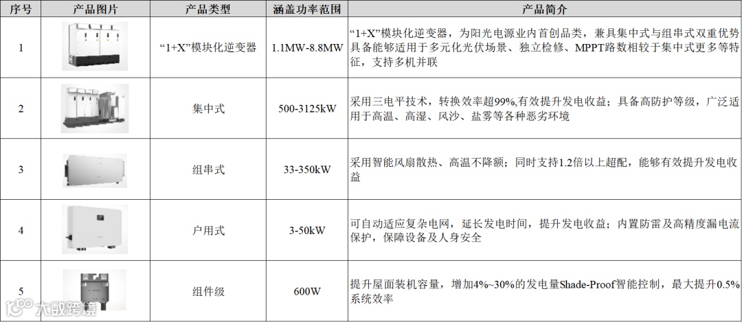 阳光电源股份有限公司(股票代码:300274)成立于1997年11月,是一家专注于新能源电源设备的研发、生产、销售和服务的国家重点高新技术企业。阳光电源聚焦于以光伏逆变器为核心的光伏组件设备的研发与生产,包括集中式逆变器、组串逆变器、户用逆变器等,在全球光伏逆变器市场一直处于领先地位。由于光伏逆变器产品种类和性能不同,各企业光伏逆变器的功率覆盖范围存在较大差异,其中,阳光电源产品功率涵盖3kW-8.8MW,8.8MW也是目前中国光伏逆变器的最大单台功率,阳光电源的产品种类和可覆盖的应用场景最为全面。