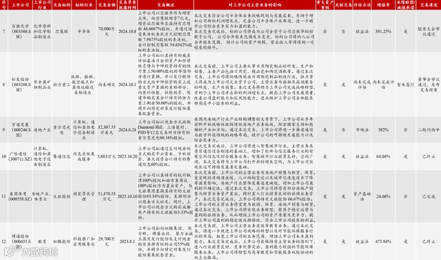 此外,也有不少处于传统行业的上市公司渴望通过跨界并购实现产业转型,例如,美利云(000815.SZ)置出传统造纸业务、注入消费类锂离子电池业务,辽宁能源(600758.SH)在原先的煤炭、电力、热力业务基础上新增新能源发电业务,莱茵体育(000558.SZ)收缩原有房地产业务置入前景良好的旅游行业,主营高等教育业务的博通股份(600455.SH)通过并购转型为高等教育和节能服务双轮驱动的双主业上市公司等。