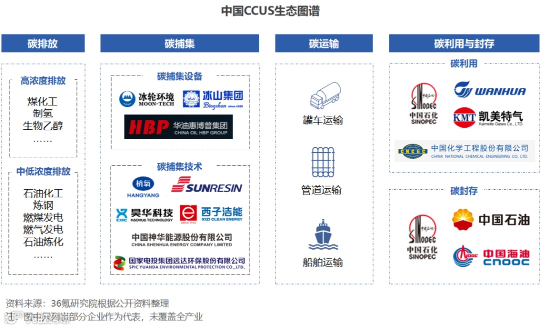 生态结构:按照产业流程,CCUS主要由碳排放、碳捕集、碳运输、碳利用与封存等环节组成