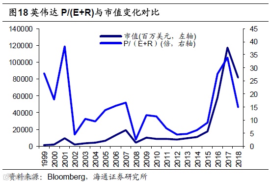 境外半导体产业链估值体系:1)半导体轻资产设计公司:在早期技术积累期研发投入较多,且短期盈利能力未得到充分释放,P/S 或者P/(E+R)是相对合理的估值方法;在成熟期,盈利能力稳定,P/E 估值系数相对合理。2)半导体设备公司:发展初期资本投入较大,且产品单一,盈利能力不稳定,P/S 估值方法相对更合理;成熟阶段设备公司产品多样化,涉足行业多样化,具有一定的抗周期能力,但公司固定资产仍然较多,摊销折旧较大,故EV/EBITDA 相对合理。3)半导体制造公司:工厂、设备等固定资产已颇具规模,营收、净利润也处于稳定增长的阶段,可以使用PE 估值;仅关注盈利指标可能会难以准确反映公司未来的成长价值,考虑到固定资产摊销的影响,EV/EBITDA 估值也相对合理。设计公司早期积累期——研发投入占比大,关注PS、P/(E+R),以英伟达为例