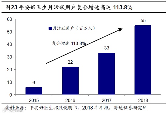 平安好医生以移动问诊核心流量入口,用户量增长迅猛。根据比达咨询数据,各类移动医疗应用日活跃用户中移动问诊类占比高达41.5%。平安好医生基于移动问诊业务优势,重点增加用户,用户增长迅猛,平安好医生注册用户从2015 年的0.303 亿户增长至2018 年的2.65 亿户,年复合增速高达106.1%,平安好医生月活跃用户从2015年560 万户增长至2018 年5470 万户,复合增速高达113.8%。公司发展早期核心在于获取用户,这一时期公司比较合适用EV/MAU、EV/DAU 来估值。