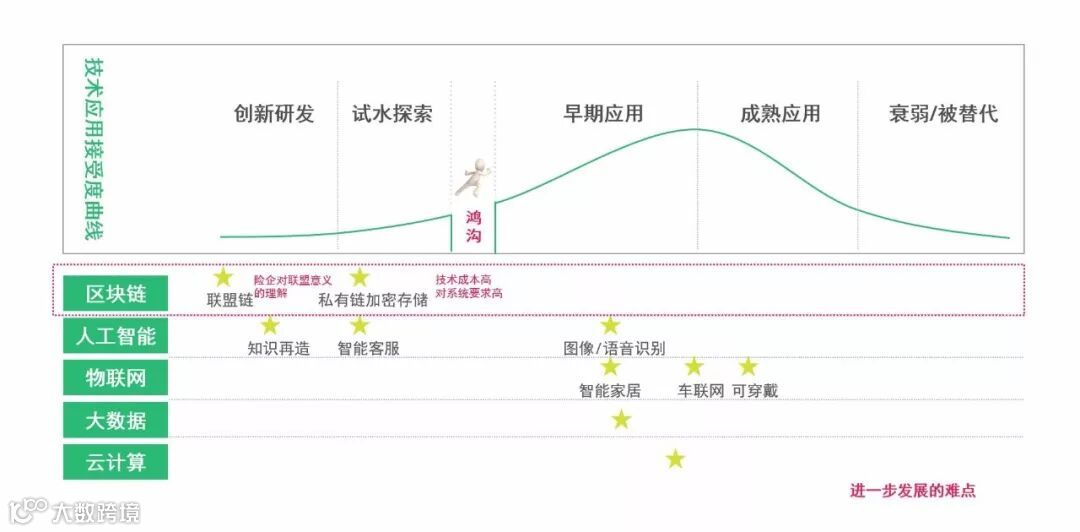 根据Gartner技术成熟度曲线,区块链技术已进入过高期望的风口期。然而,区块链在金融行业的应用尚未完全普及。以保险行业为例,目前区块链技术仍处于早期研发和试水阶段,主要面临两个难点:一是保险企业对联盟意义的理解;二是区块链技术成本高、对系统要求高。这两个难点使区块链广泛应用存在一定障碍(参阅图2)。