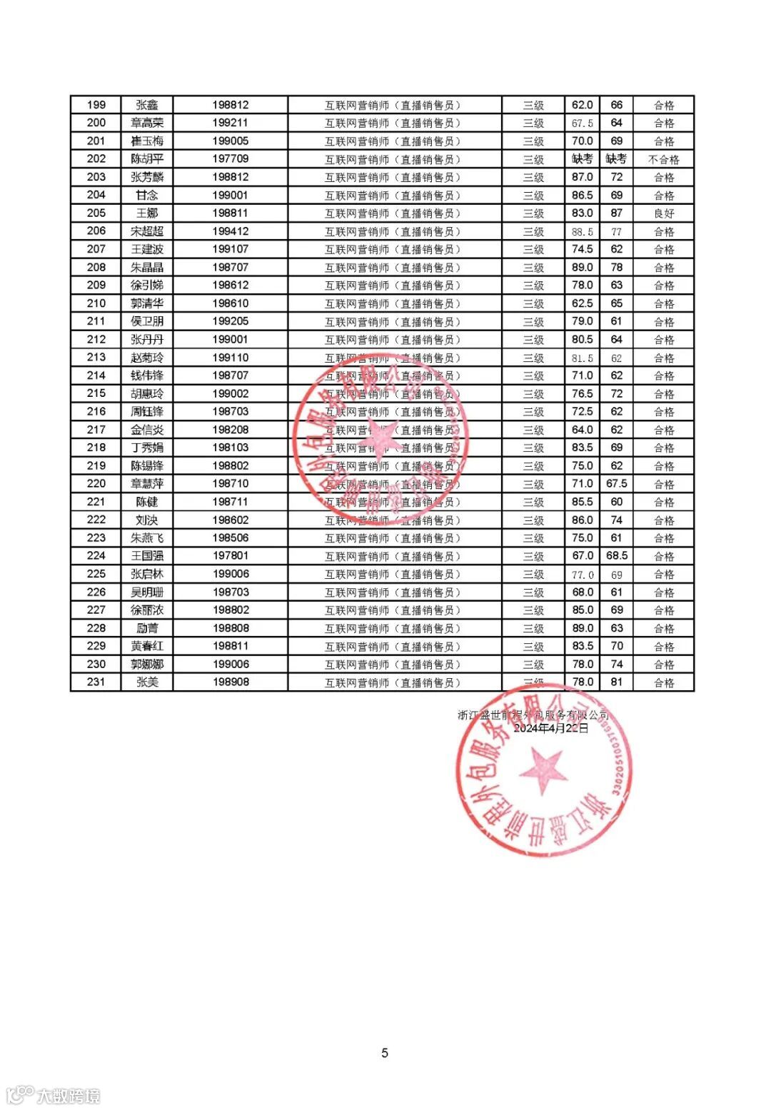 根据相关管理规定,现将互联网营销师(直播销售员)三级等级认定考生成绩公示如下,公示期为2024年4月22日-2024年4月26日。公示期间,如有异议,请向本机构反映。