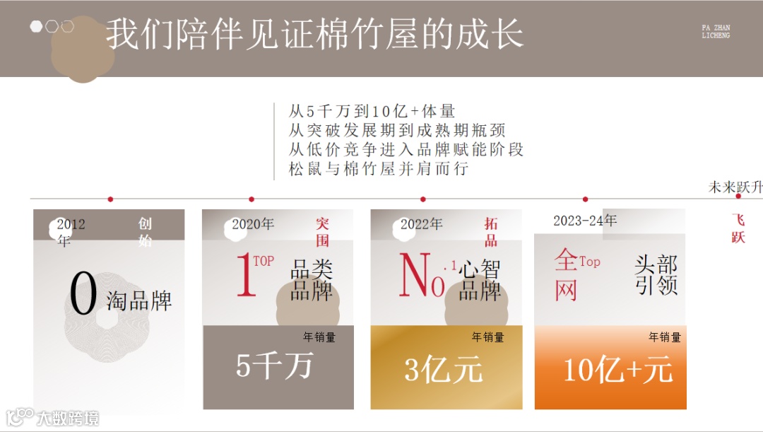 棉竹屋是松鼠从0到1陪伴成长的品牌,从千万级开始合作,续签4年,4年经历3次品牌迭代和升级,帮助棉竹屋解决不同阶段发展的生意问题,在品牌的不同阶段,战略定位、拓品、营销增长、视觉升级,助力棉竹屋1年实现类目第一,4年从千万到8亿体量的飞速增长。