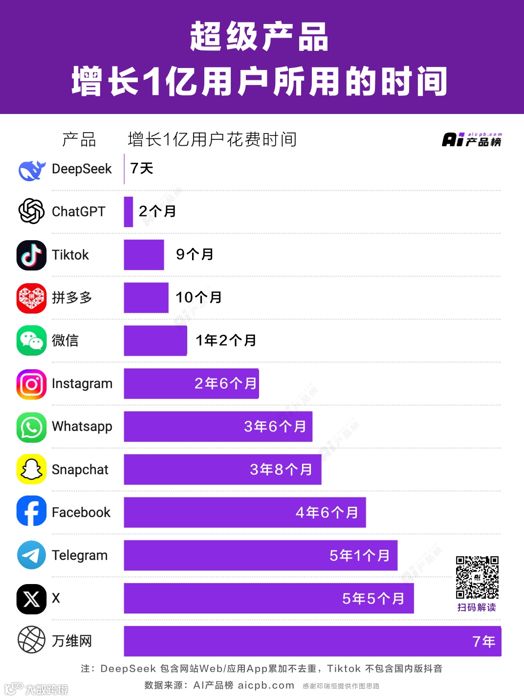 同时,DeepSeek仅用一周就用户破亿,而ChatGPT用时2个月。