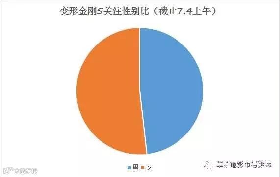 由图可见,《变5》的关注性别比相较于《变4》有很大变化,关注《变4》的男性所占比例高达86%,而在《变5》处男性比例只占48%,女性比例反而增长至52%,如今枪战与机甲早已不是男性的专利,女性也在越来越多的关注和参与好莱坞大电影。