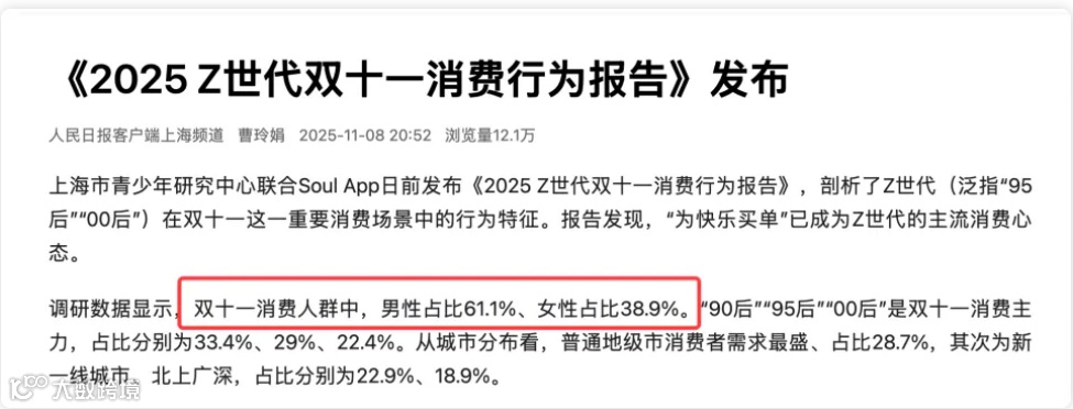 今年的双十一,一个标志性的数据出现:在Z世代消费人群中,男性占比高达61.1%,超过了占比38.9%的女性,成为了绝对的消费主力。