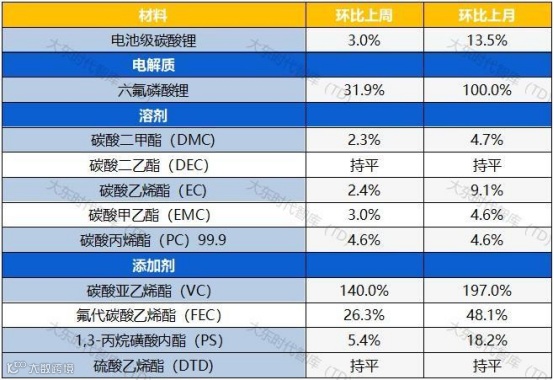 添加剂与溶剂:添加剂VC、FEC、PS价格上涨,溶剂DMC、EMC、EC价格上涨。