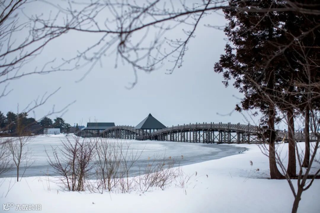 鹤之舞桥,它的设计灵感来源自于鹤的优美姿态,以岩木山为背景,鹤之舞桥宛如空中翩翩起舞的白鹤,据说,走过这段桥便能长命百岁。