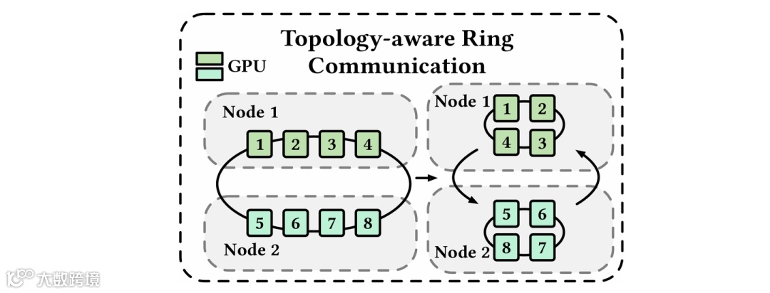 比如清华大学的BurstEngine[2]和北京大学的LoongTrain[3]中使用多层次的Ring-AllGather取代单层次的Ring-AllGather以充分利用节点内的高带宽。BurstEngine中称之为Topology-aware Ring Communication,LoongTrain中称之为Double Ring Attention。