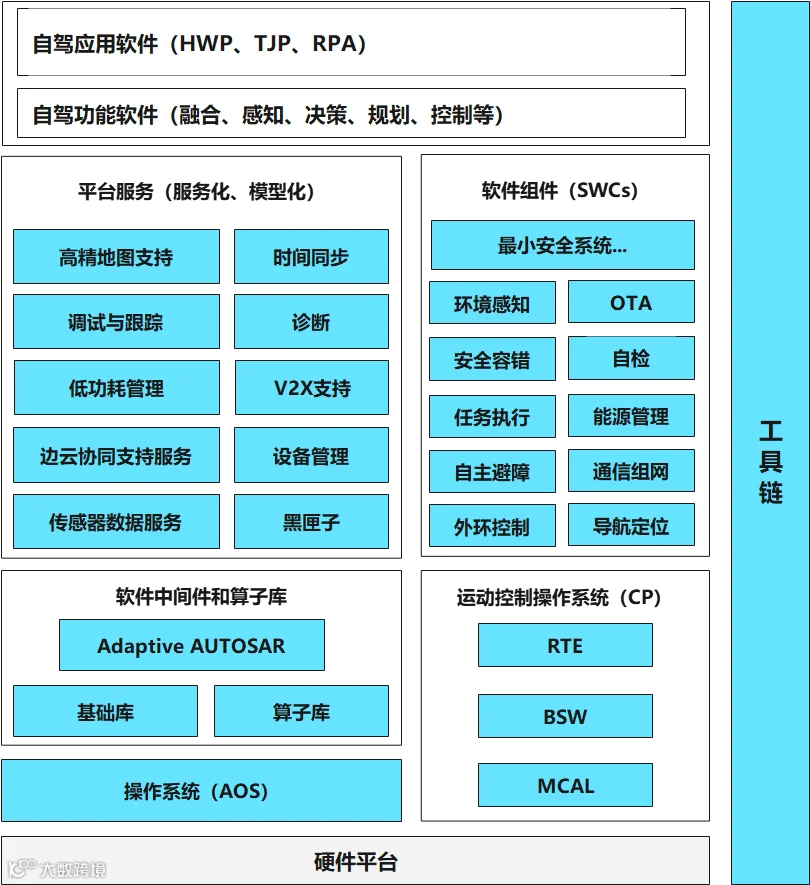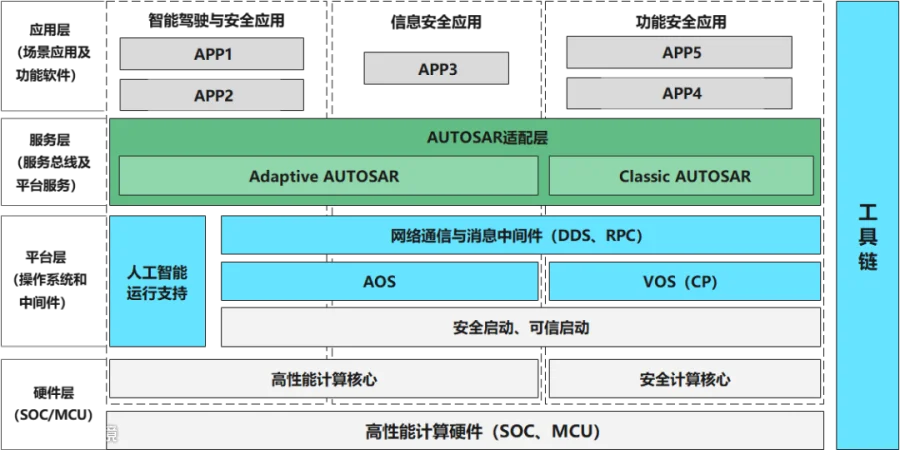 a.AOS与VOS操作系统:基于通过CC EAL5+安全认证的商用OS内核,符合ASIL D的功能安全架构和安全机制要求,可基于用户态分布实时通信架构,保障上层应用的确定性低延时。操作系统兼容主流的POSIX标准接口和主流基础库。