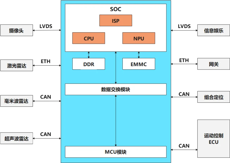 如图所示,MDC产品采用集中式计算的方案,在一个平台集成了ISP信号处理模块、CPU模块和NPU模块。提供CAN总线、视频信号总线和以太网三种接口。整个SOC可提供提供超过200TOPS 的AI算力和超过200KMips的串行算力。