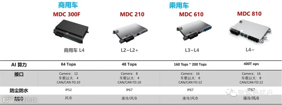 MDC平台一共有四个产品,分别是MDC 300F、MDC 210、MDC 610、MDC 810。其中MDC 300F主要是用在商用车上,另外三个用于乘用车,四个产品的关键参数如下图所示。