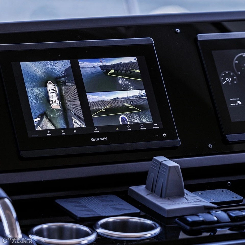 沃尔沃Penta的360度全景摄像头视图,可以同时控制音乐、灯光、舱内温度和百叶窗;内置的 Garmin 环视摄像头系统可通过实时鸟瞰视频和 360 度驾驶视野消除盲区。它还具有可调节的距离警报功能;其智能船舶设计可以在水位过高或电池电量过低时,系统会发出警报提醒,同时您还能实时了解船舶的状况。