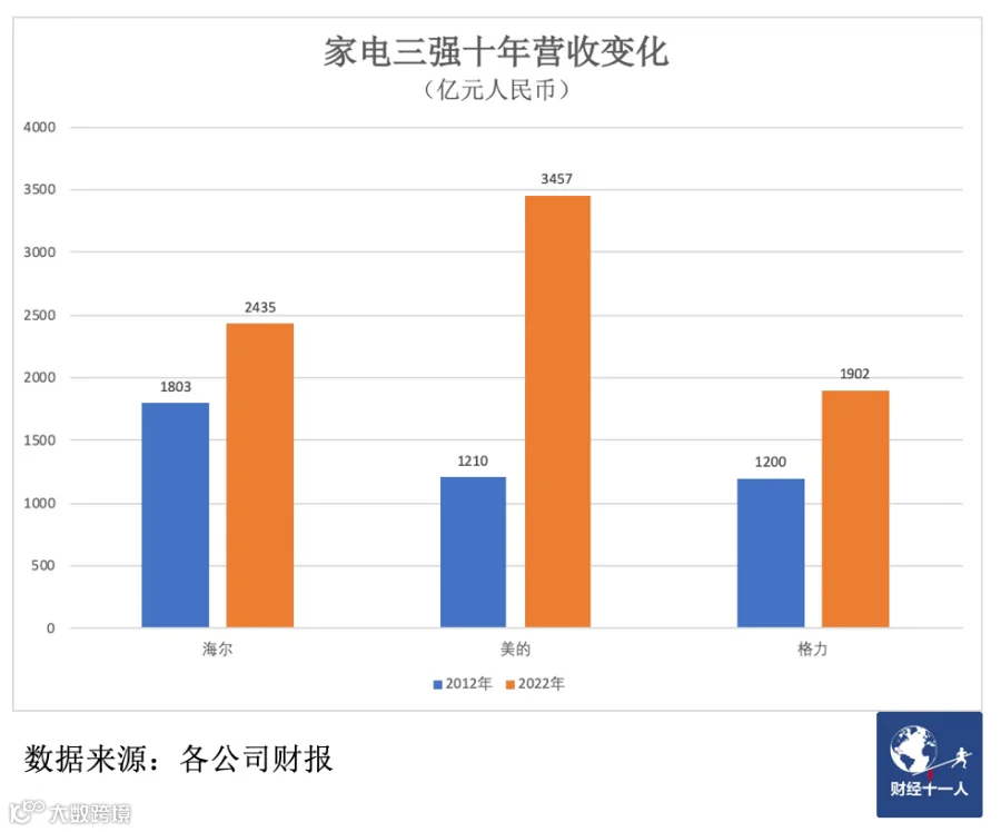 从2012年到2022年,美的的营收从1027亿元增长至3457亿元,净利润从61亿元增长至298亿元。更关键的是自有资金从51亿元增长至1358亿元,而资金周转周期从26天减小至-2.5天。