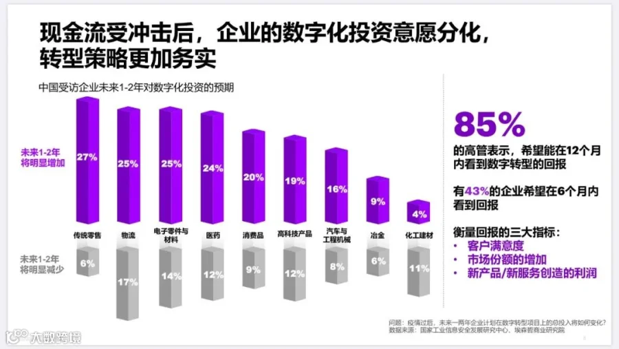 数字化基础设施好的企业应对得普遍更好,体现出更强的韧性。另一方面,市场形势的变化也考验着企业的数字化投入决心。