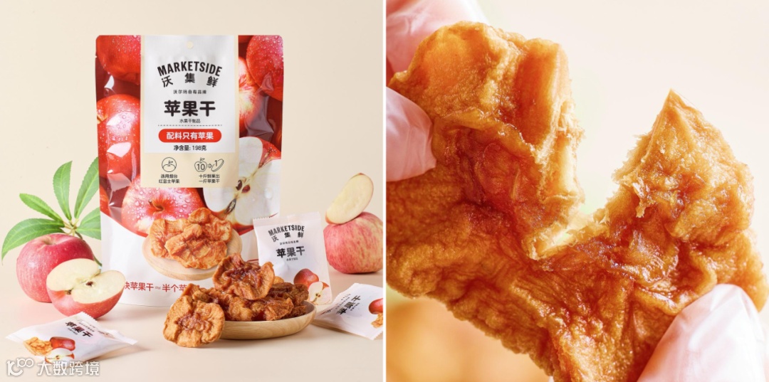 以沃集鲜苹果干为例,这是一个能直观体现「简单为鲜」原则的产品。沃集鲜选用山东烟台红富士,每一块折算回鲜果约半个苹果,配料表干净到只剩下「苹果」这一项。没有额外添加的香气,也不靠甜味剂去模拟风味,它呈现的就是苹果本身该有的酸甜。