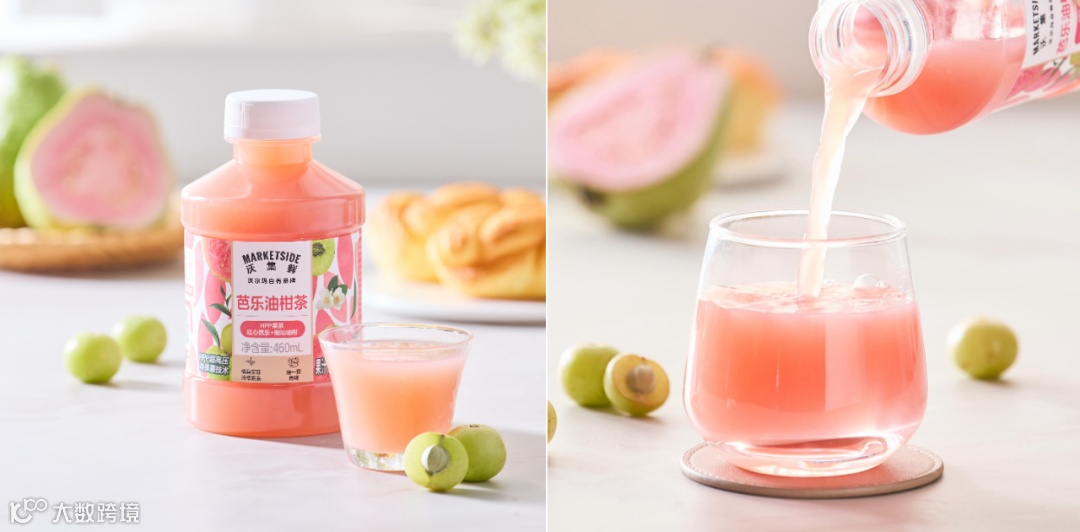 沃集鲜芭乐油柑茶遵循了同样的逻辑。不仅原料甄选福建芭乐、潮汕油柑,再搭配鲜萃茉莉茶底,在配方天然的基础上,还使用了 HPP 冷压鲜榨技术,让果茶在不牺牲风味的前提下延长保质期、减少防腐剂使用。