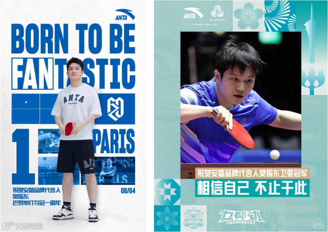 另一方面,随着全民体育氛围高涨,体育明星的影响力在过去几年快速飞升。捕捉到这一风向,安踏持续强化与体育明星合作的策略。其中最具代表性的,便是安踏在由李宁赞助的中国国家乒乓球队中,拿到了樊振东的品牌代言合作,并且不断深化其合作形式。