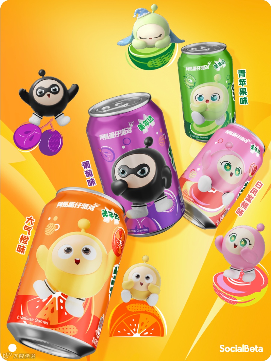其次,美年达敏锐捕捉到年轻一代「正在进行时」的新兴消费趋势,将其做为产品创新的源动力。反映在此次联名产包和周边的设计上,品牌将产品与蛋仔 IP 形象深度绑定,搭上了「吃谷热」的风潮,最大程度上撬动 IP 势能。