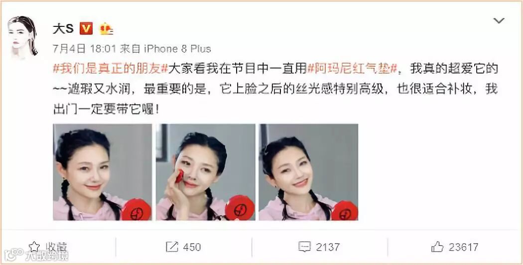 不仅如此,阿玛尼对于捕捉热点与制造爆点也是一把好手。大 S 在节目中用的草莓包受到大量关注,在 #大 S 草莓包# 登上微博热搜后,品牌以其敏感的热点嗅觉及时在节目中安排翻包环节,利用网友们对于大 S 惯用美容单品与美妆心得的好奇,将阿玛尼红气垫无缝植入,捆绑「美容大王」影响力,强势助力产品声量猛增。