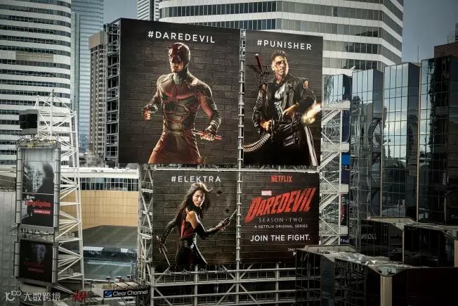 《超胆侠》是漫威与美国在线影片租赁提供商 Netflix 的合作剧,为了给新一季节目预热,四月初,广告公司 DDB 温哥华就在多伦多邓达斯广场立起来了一块特殊的广告牌。这个广告牌分别表现了三个主角——超胆侠,惩罚者和艾丽卡! 由于「粉丝效应」无处不在,这几个角色也各自有着自己的「后援团」,Netflix 抓住观众偏向自己喜欢的角色的心情,设置了 #超胆侠,#夜魔侠和 #艾丽卡这样的话题标签,来吸引三人的支持者们也参与到「战斗」中。每隔 48 小时会放出大招:标签被提到次数最多的角色可以以一种胜利者的姿态,对其他两块广告牌添上伤害痕迹,比如子弹孔,划痕,擦伤,甚至运用 3D 武器进行「暴击」……