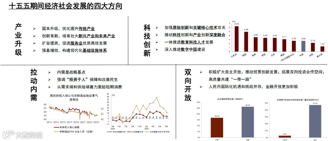 图表:“十五五”期间经济社会发展的主要方向:产业升级、科技创新、拉动内需、双向开放