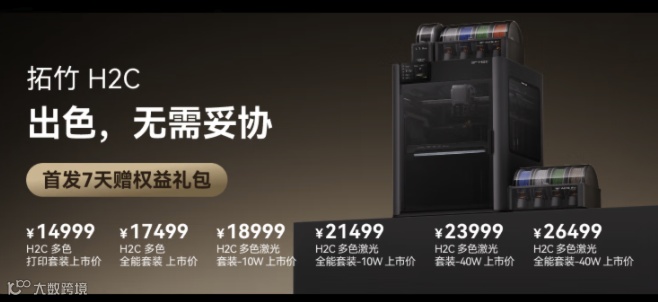 H2C以14999元起的定价(最高配40W多色激光全能套装26499元),将工业级多材料打印能力下放至桌面级市场,填补了专业用户与工业设备之间的空白。