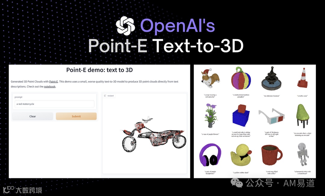Point-E 由ChatGPT背后的AI公司OpenAI推出的Point-E,是一款开源的AI 3D建模工具。与其他工具不同,Point-E采用了点云和扩散模型相结合的方法。它首先根据文本或图像提示生成一个低分辨率的点云模型,然后通过点云扩散的方式不断优化和增强细节,最终生成高质量的3D网格模型。这种方法可以更好地捕捉物体的几何形状和拓扑结构,生成更加准确和细节丰富的3D模型。